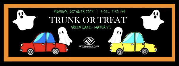Trunk or Treat is coming back to Green Lake! Join us for this family friendly event hosted by Boys and Girls Club. This safe, fun and FREE kids' event is open to the public. Dress up in your ghoulish costume and visit area businesses' trunks for various treats! Rain or shine! Inclement weather will move the event indoors at Town Square. Interested in hosting a trunk? That's SPOOKTACULAR! Complete the registration form by October 15th to reserve your parking spot! https://forms.gle/KW1Rf7Ecm2A6LKMcA If you have any questions, please contact Green Lake Site Coordinator, Kelsey Adams at 920-229-3455.