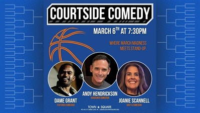 March Madness may be tipping off, but this Friday night the real action is on stage. Courtside Comedy brings you a night of stand-up packed with big laughs, sharp wit, and punchlines that hit harder than a buzzer-beater. No brackets required—just grab a seat and enjoy comedy that’s fast, funny, and full-court entertaining. Your host Joanie Scannell returns to Town Square to keep the laughs moving, joined by feature comedian Dame Grant and headliner Andy Hendrickson, delivering a lineup worthy of a championship night. Think March Madness… but with better jokes and fewer whistles.