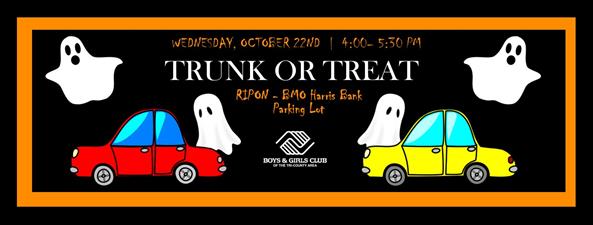 Join the Boys & Girls Club of the Tri-County Area on Wednesday, October 22nd from 4:00 - 5:30pm for our Ripon site's Trunk or Treat! Trunks will parked in BMO's parking lot directly behind the Ripon Boys & Girls Club. Get dressed up in your favorite costume to go Trunk or Treating with your friends and family! Thank you in advance for joining us in creating a fun and spooktacular event for area kids!