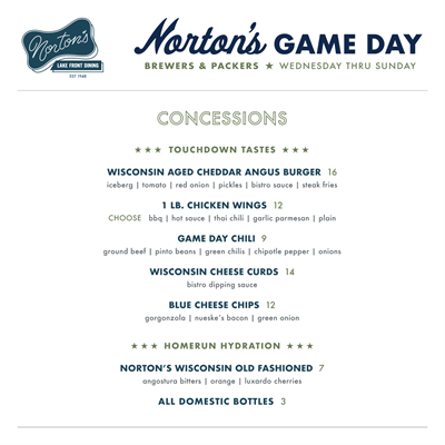 Join us at Norton's for the Packers Game - we're away and playing the Giants! Norton's loves to bring the community together for our favorite Wisconsin teams! The bar will be open, and we'll have our game day menu available for some great food to accompany the game, and your wonderful company! Don't miss this opportunity to join us at Norton's on for a cozy Sunday afternoon of football, food and friends!